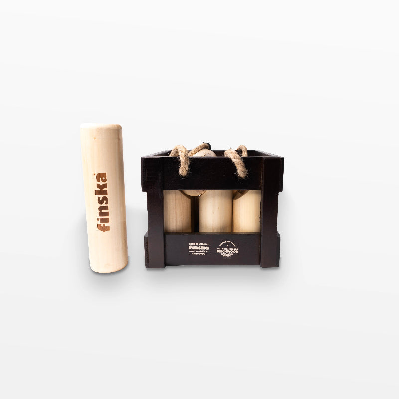 Finska Preemio Black comes with varnished hardwood carry crate, 12 numbered pins, throwing log as well as rule card and score sheet. Disclaimer: Despite it's name, Finska Preemio Black has an ebony finish that can look either black or a rich dark brown depending on the light.