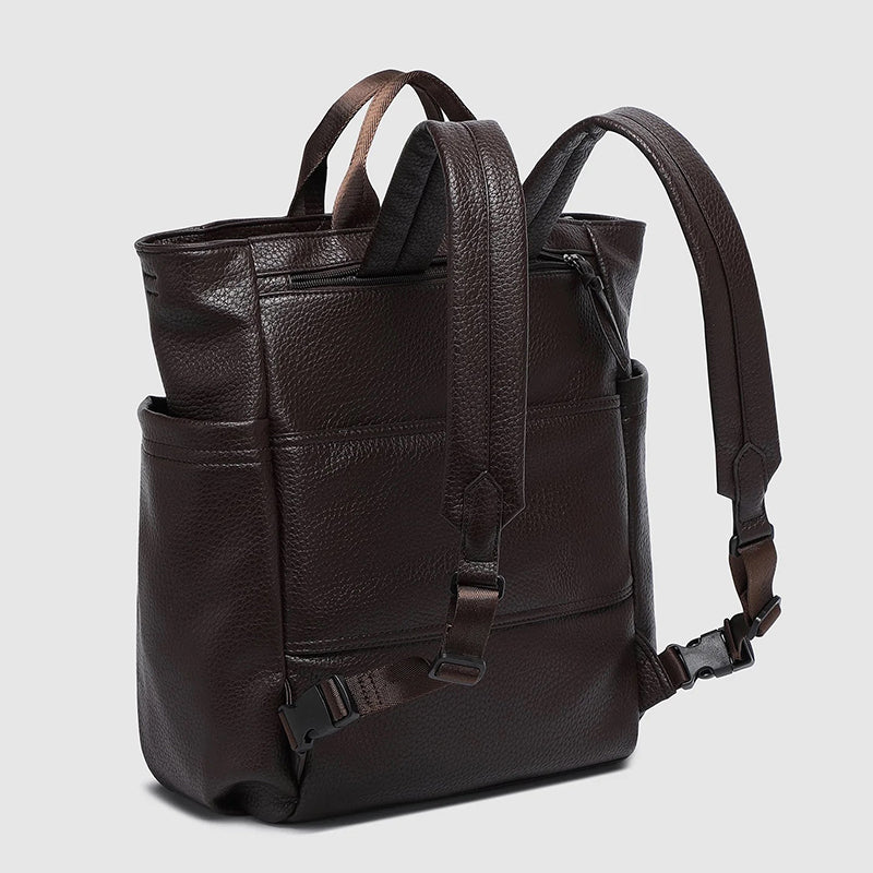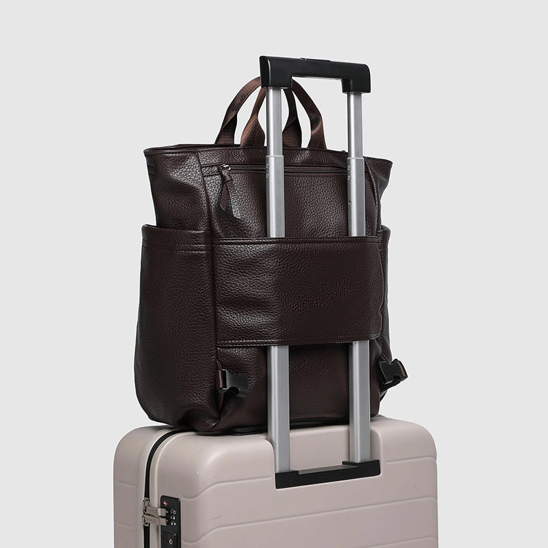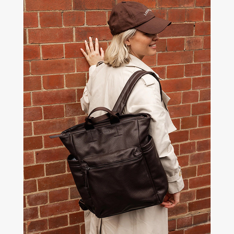 The Bronx Chocolate Backpack combines modern functionality with a refined, versatile design. Made from smooth vegan leather, she transitions effortlessly from workdays to weekends with adaptable wear options - tuck away the backpack straps and attach the adjustable crossbody strap, or slip her over your suitcase handle for seamless travel.